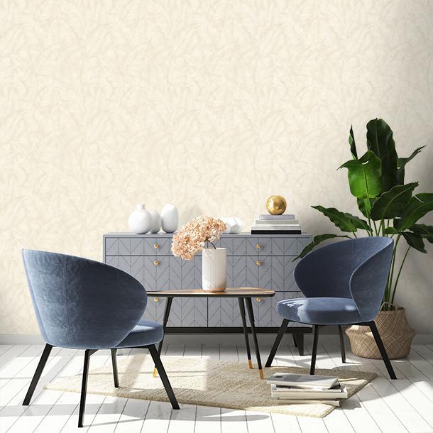 Luxus-Tapete mit Vinyloberfläche, plastische geprägte Blätter in Weiß- und Cremetönen.