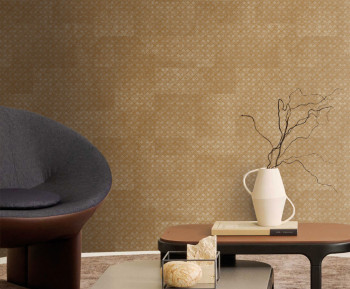 Luxus-Tapete mit Vinyloberfläche, halbglänzender Hintergrund in Brauntönen, feines plastisches bronzefarbenes Karomuster, Farbtöne bilden ein flächiges geometrisches Design.