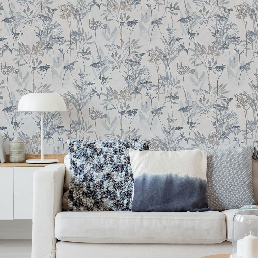 Vliestapete mit Vinyloberfläche, weißer Putzhintergrund, Motive von Gräsern und Blättern in Blautönen, stellenweise mit metallischem Halbmatt-Effekt.