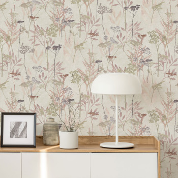 Vliestapete mit Vinyloberfläche, weißer Putzhintergrund, Motive von Gräsern und Blättern in Rosa-, Lachs- und Violetttönen, stellenweise metallisch golden.