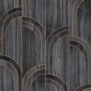 Vliestapete mit Vinyloberfläche, Dekor aus grau-schwarzer Holzverkleidung mit metallisch goldenen Linien.