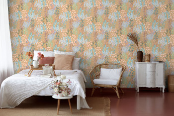 Vliestapete mit Vinyloberfläche, braun-orangefarbener Hintergrund, Blumen- und Blattmotive, goldene Details, feine Textur.