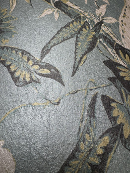 Vliestapete mit exotischen Vögeln zwischen Blumen und Ästen, halbglänzender türkisfarbener Hintergrund, gold-beiges und türkisfarbenes Muster, faserige Textur.