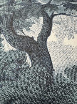 Vliestapete mit Motiv Wald, Bäume in Blau-Grün-Tönen, mit Stofftextur-Effekt.