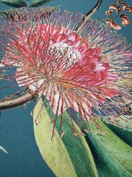 Vliestapete mit grünem Hintergrund und Motiv blühender Passionsblumen-Zweige.