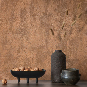 Vliestapete mit Vinyloberfläche, Dekor einer braun-bronzefarbenen Putzoptik, matt und mit leichtem Glanz, feine Struktur.