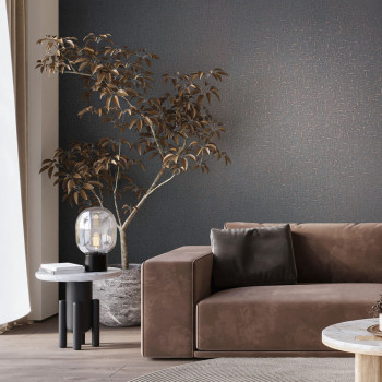 Vliestapete mit Vinyloberfläche, Stoffoptik in Grau-Schwarz-Tönen, teilweise mit bronzefarbenen Details und metallischen Akzenten.