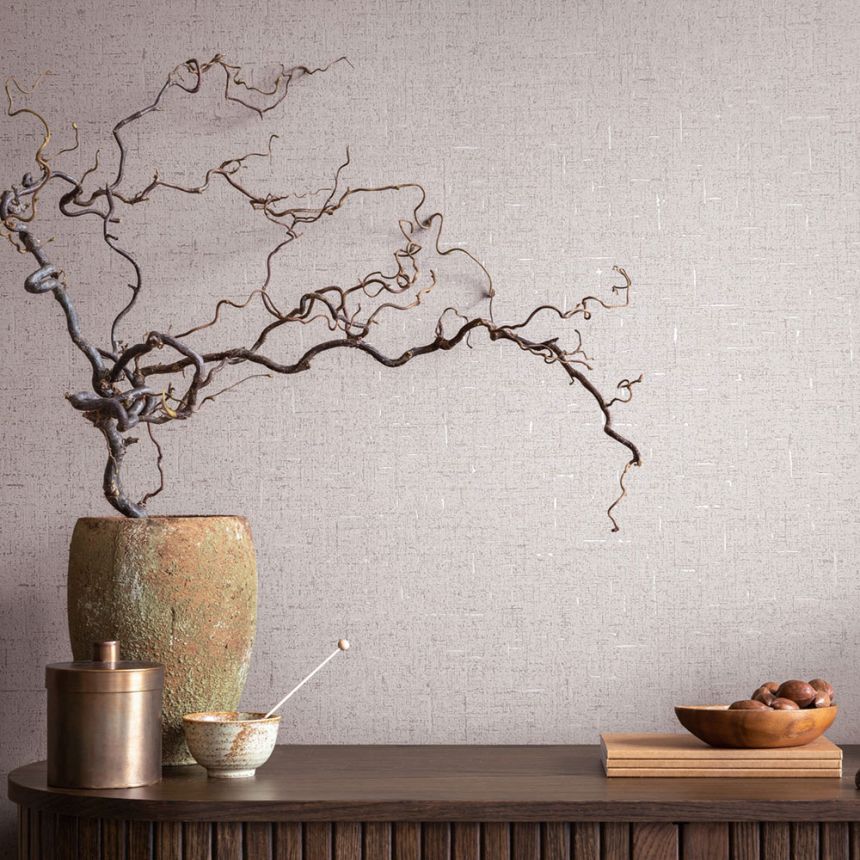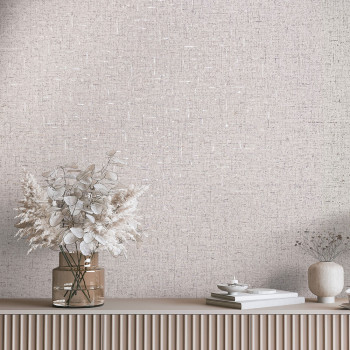 Vliestapete mit Vinyloberfläche, Stoffoptik in Beigetönen, teilweise mit glänzenden Details und metallischen Akzenten.