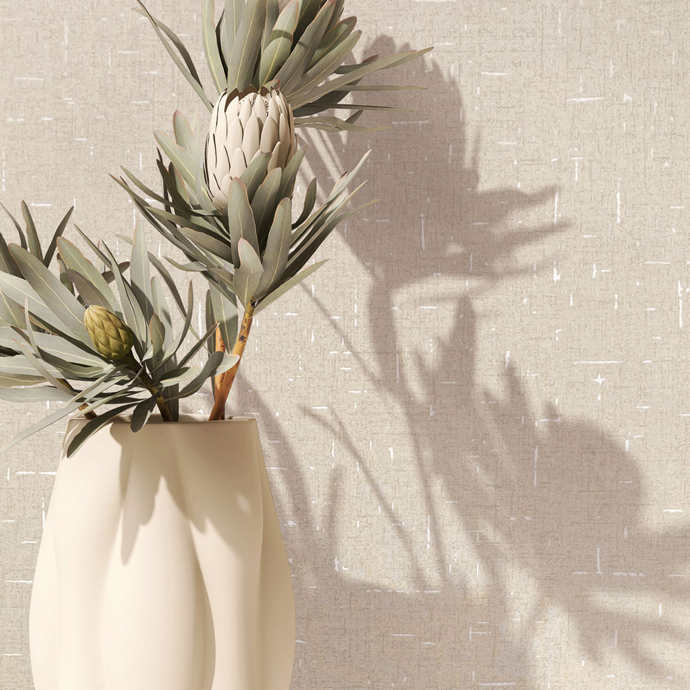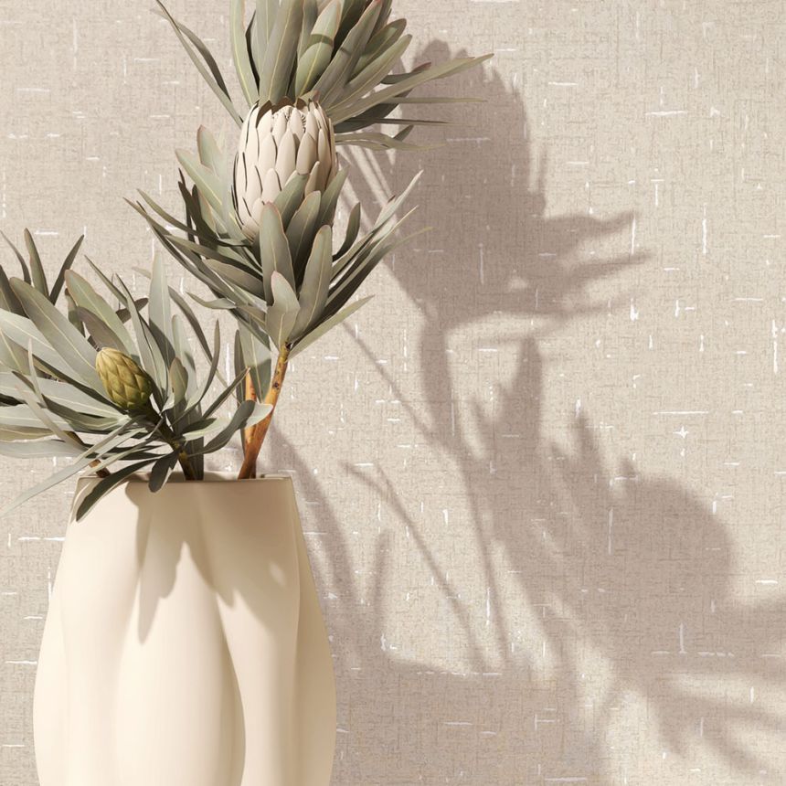 Vliestapete mit Vinyloberfläche, Stoffoptik in Cremetönen, stellenweise glänzende Details und metallische Akzente.