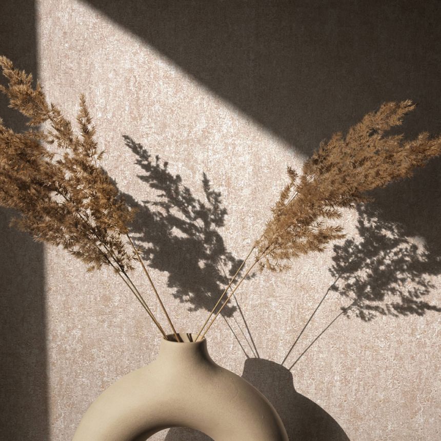 Vliestapete mit Vinyloberfläche, Dekor in Beige-Rosa mit Putzoptik, feine Struktur.