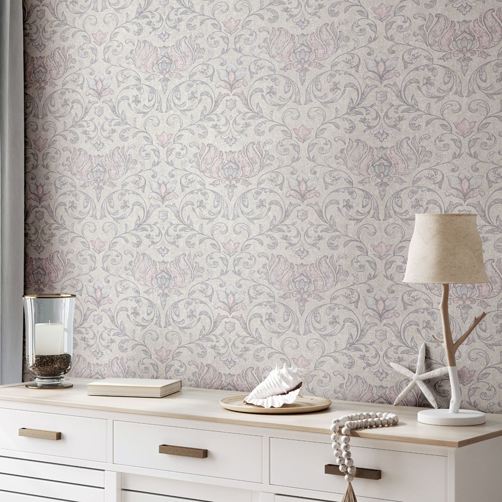 Vliestapete mit Vinyloberfläche, ornamentales Schlossmuster im Vintage-Stil, Farbtöne in Beige, Grau und Rosa, feine Struktur.