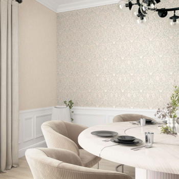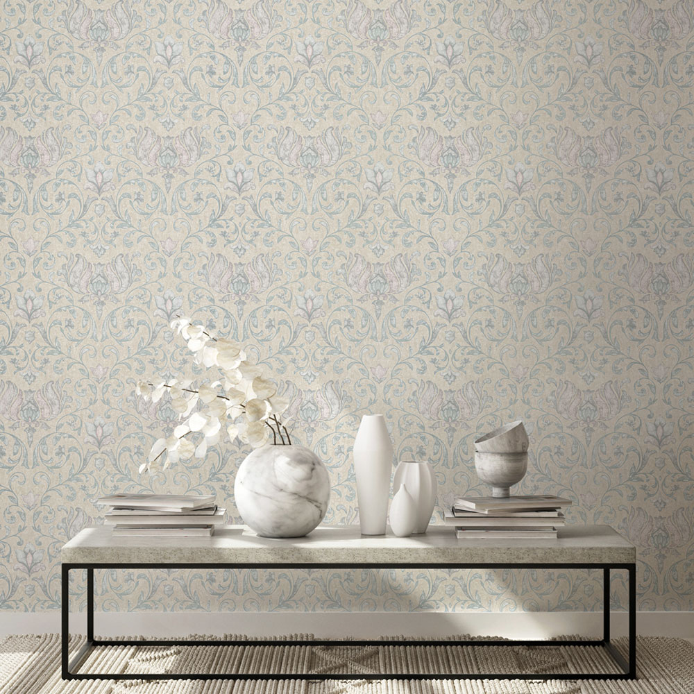 Vliestapete mit Vinyloberfläche, ornamentales Schlossmuster im Vintage-Stil, Farbtöne in Beige, Grau-Grün und Rosa, feine Struktur.