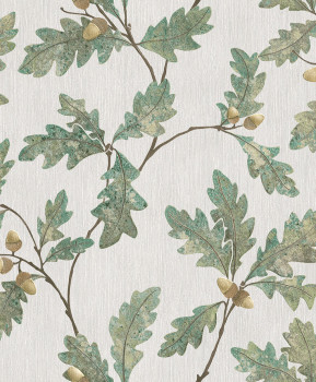 Vliestapete mit Vinyloberfläche, graue gestreifte Struktur, Motiv mit Eichenzweigen, in Grün- und Brauntönen.