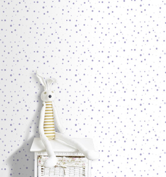 Verwandeln Sie strenge Wände in ein gemütliches Kinderzimmer, in dem sich Ihre Kinder wohlfühlen werden. Tupfen in Violetttönen auf weißem Hintergrund. Kombinieren Sie einfach mit verwandten Tapeten.