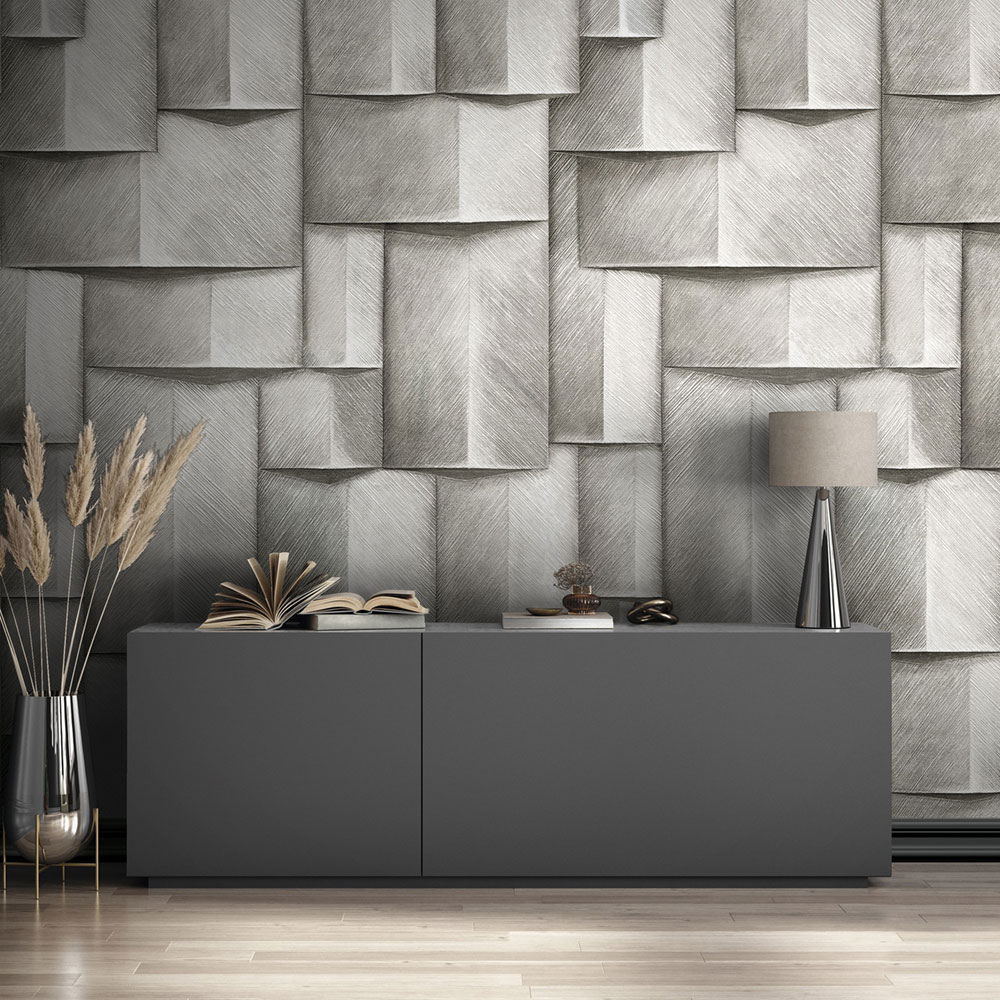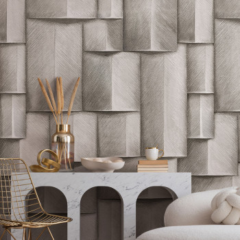 Vliestapete mit Vinyloberfläche, feine Struktur, grafisches Muster, Schattierung erzeugt einen 3D-Effekt.