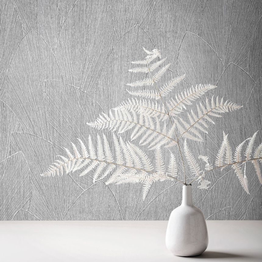 Vliestapete mit Vinyloberfläche, gestreifte Struktur mit Blattkonturen in Grau- und Grau-Blau-Tönen.