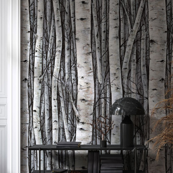 Foto-Vliestapete mit Vinyloberfläche, gestreifte Struktur, Baummotiv mit Birkenhain in Grau-Blau-Tönen.