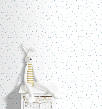 Verwandeln Sie strenge Wände in ein gemütliches Kinderzimmer, in dem sich Ihre Kinder wohlfühlen werden. Punkte in Blautönen auf weißem Hintergrund. Kombinieren Sie einfach mit verwandten Tapeten.