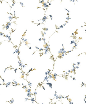 Luxuriöse Vliestapete mit Vinyloberfläche, weißer Hintergrund mit Stoffstruktur, Blumenmotiv in Blau-, Khaki- und Brauntönen.