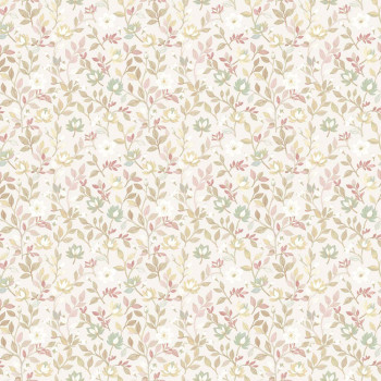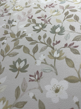 Luxuriöse Vliestapete mit Vinyloberfläche, hellbeiger Grundfarbe, Blumenmotiv in Rosa-, Grün- und Ockertönen.