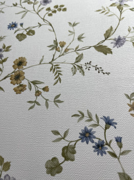 Luxuriöse Vliestapete mit Vinyloberfläche, Blumenmuster, Stoffstruktur, Farbtöne in Blau, Ocker und Khaki.