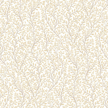 Luxuriöse Vliestapete mit Vinyloberfläche, Stoffstruktur, cremeweißem Hintergrund, Motiv aus Zweigen mit Blättern, in Beige- und Brauntönen.