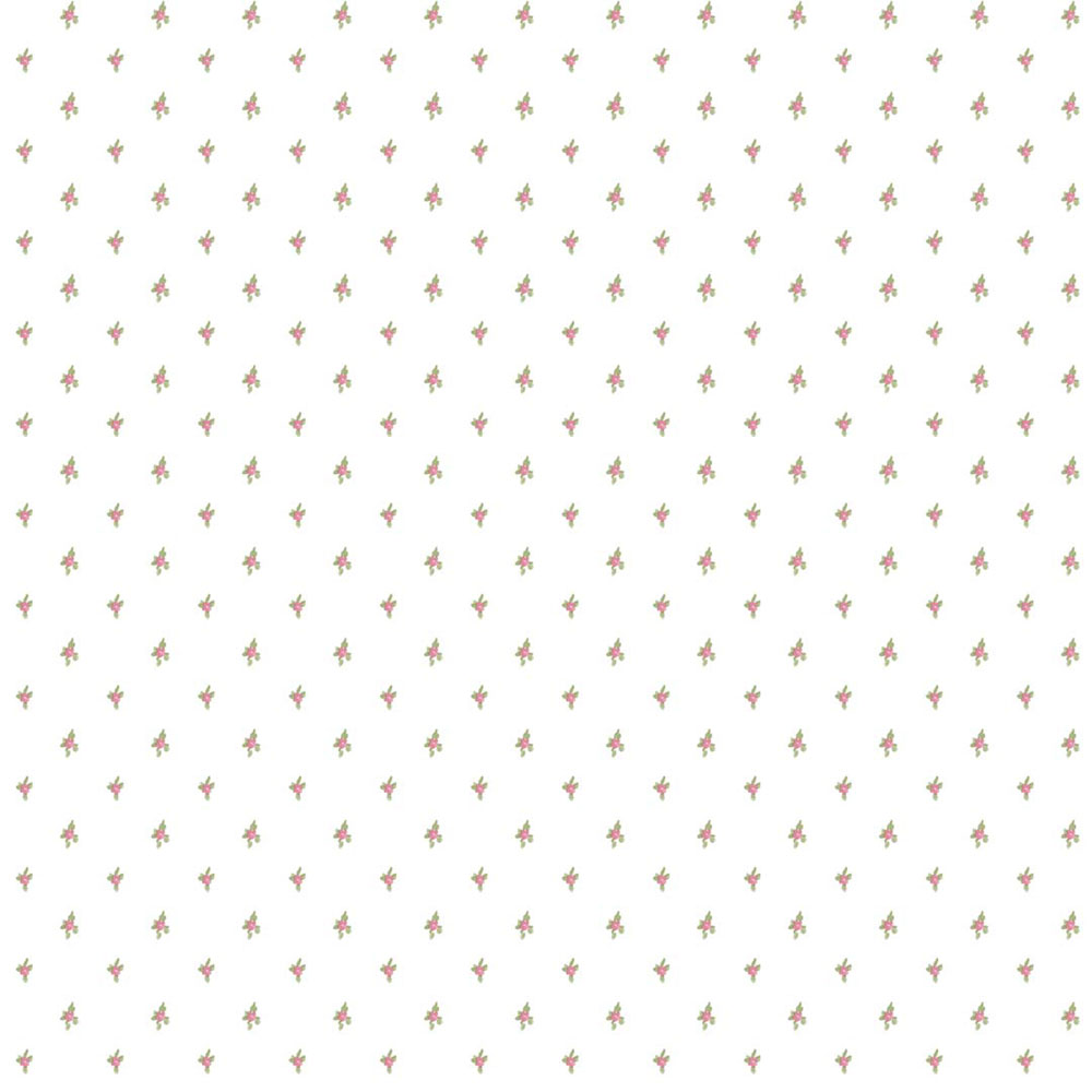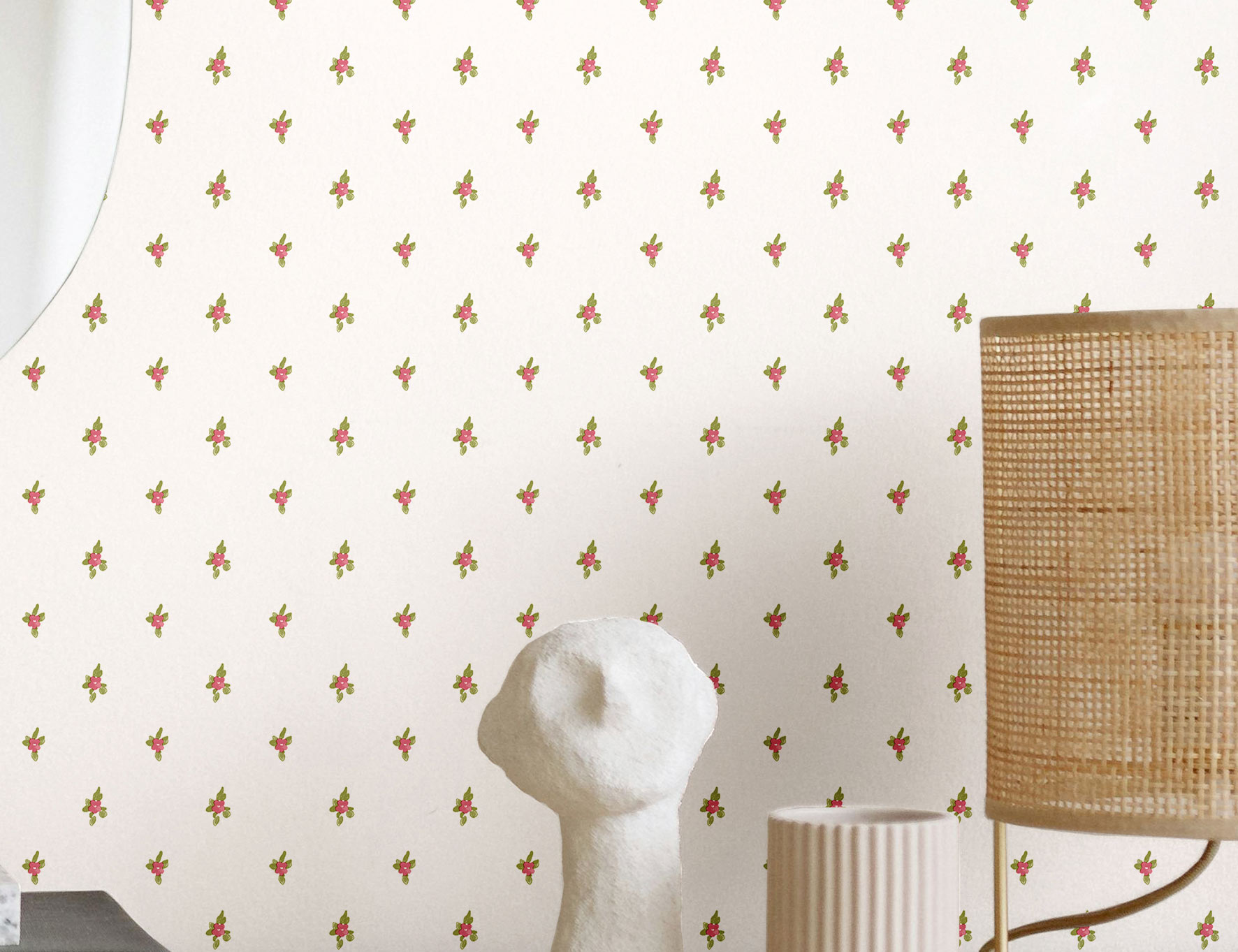 Luxuriöse Vliestapete mit Vinyloberfläche, cremefarbener Hintergrund, kleine Blümchen in Grün- und Rosatönen.