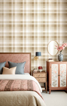 Luxuriöse Vliestapete mit Vinyloberfläche, Stoffstruktur; das Muster erinnert an einen Tartan-Stoff in Beigetönen.