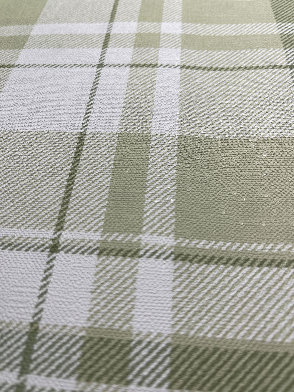 Luxuriöse Vliestapete mit Vinyloberfläche, Stoffstruktur; das Muster erinnert an einen Tartanstoff in Grüntönen.