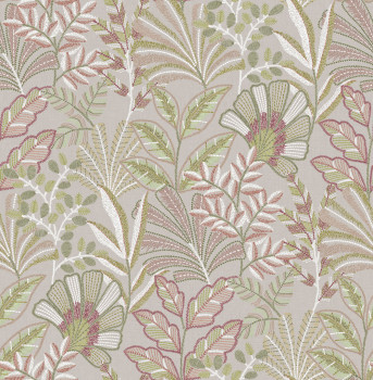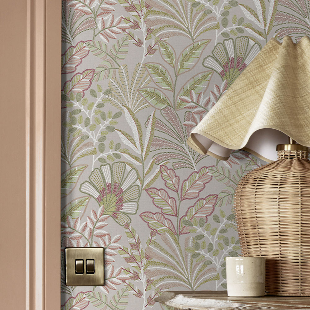 Vliestapete, Design inspiriert von Stickereien, in Beige-, Grün- und Rosatönen.