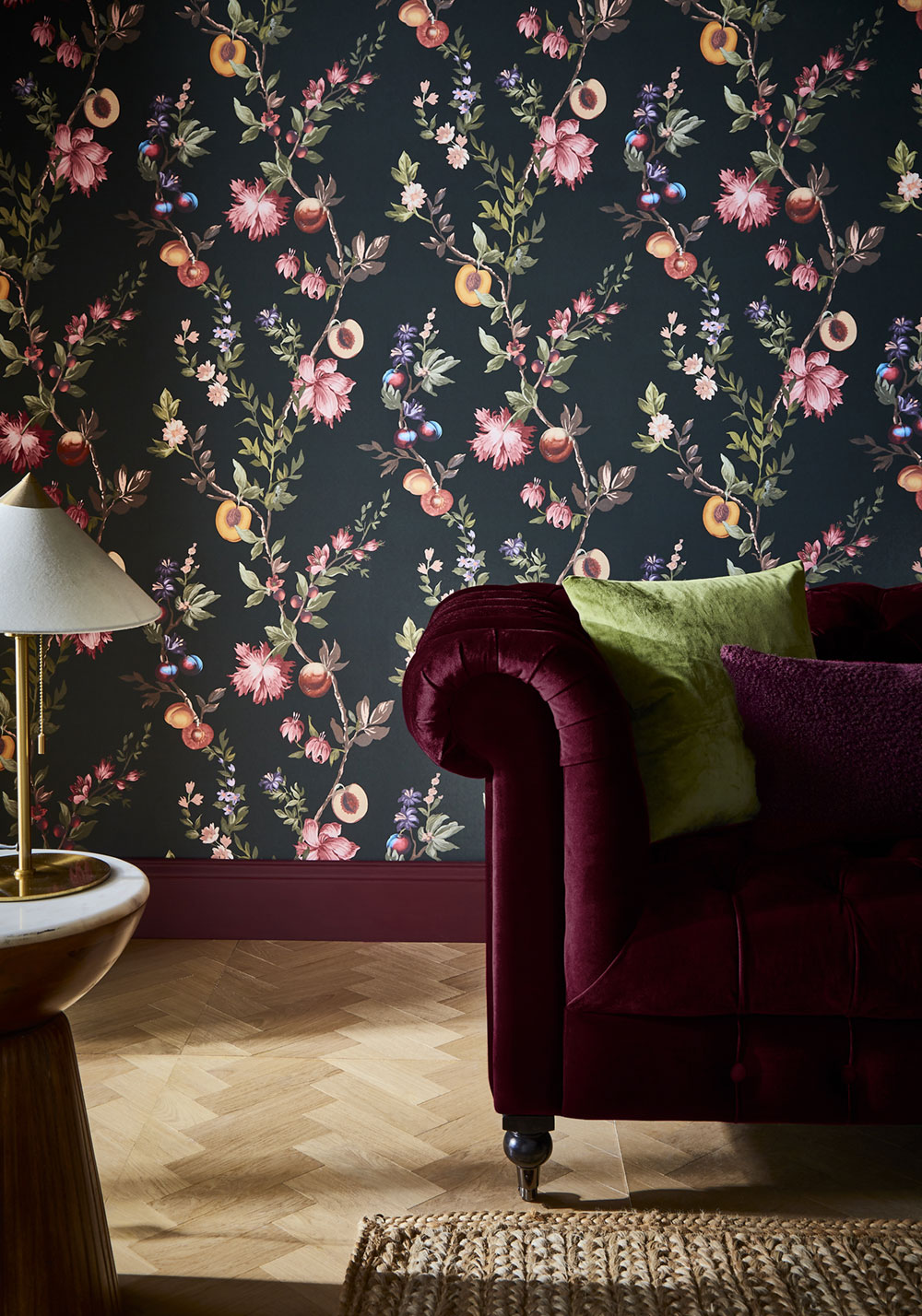 Hier finden Sie ausdrucksstarke florale Muster, von kleinen Blüten auf dunklem Hintergrund, die mutig, elegant und leicht verführerisch wirken, bis hin zu sanfteren Varianten auf hellem Untergrund. Ein wunderschönes Detail sind die Zweige von Pfirsichbäumen und anderen Obstbäumen, reich an Blüten und Früchten, die den Tapeten Natürlichkeit, Frische und eine romantische Atmosphäre verleihen.