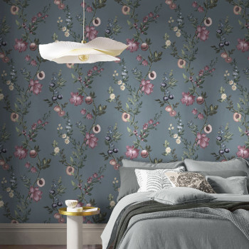 Vliestapete, blauer Hintergrund, Zweige mit Blumen und Früchten.