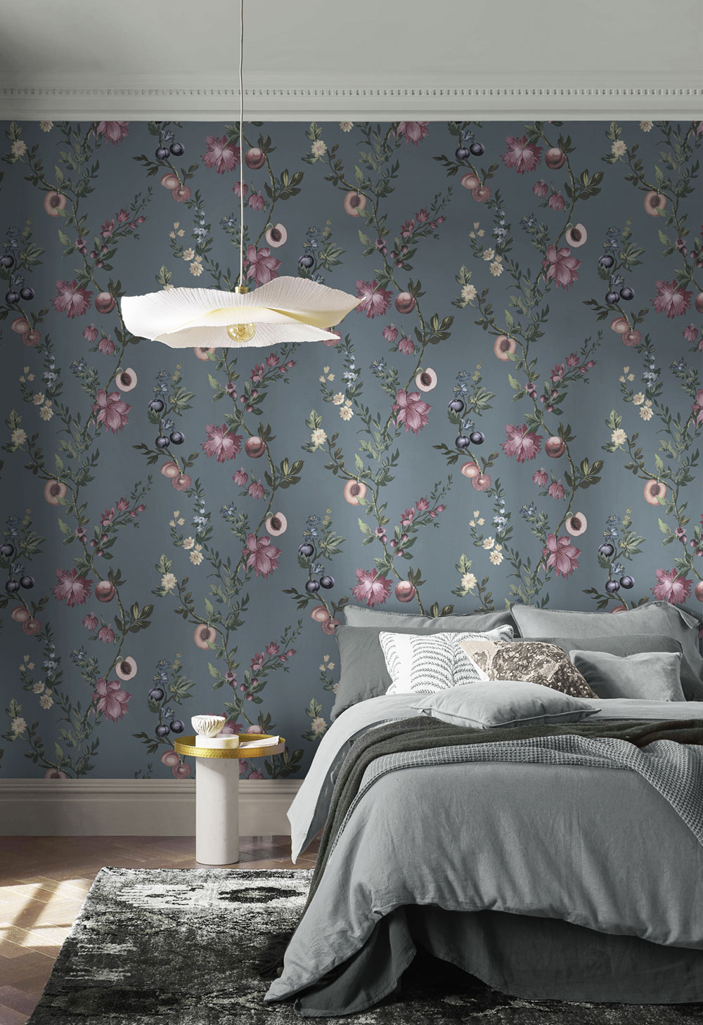 Hier finden Sie ausdrucksstarke florale Muster, von kleinen Blüten auf dunklem Hintergrund, die mutig, elegant und leicht verführerisch wirken, bis hin zu sanfteren Varianten auf hellem Untergrund. Ein wunderschönes Detail sind die Zweige von Pfirsichbäumen und anderen Obstbäumen, reich an Blüten und Früchten, die den Tapeten Natürlichkeit, Frische und eine romantische Atmosphäre verleihen.