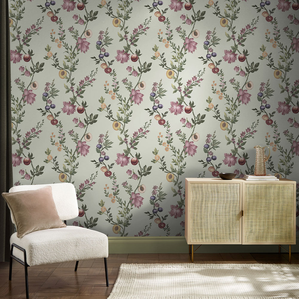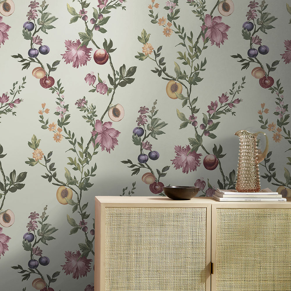 Vliestapete, hellgrüner Hintergrund, Zweige mit Blumen und Früchten in Rosa- und Violetttönen.