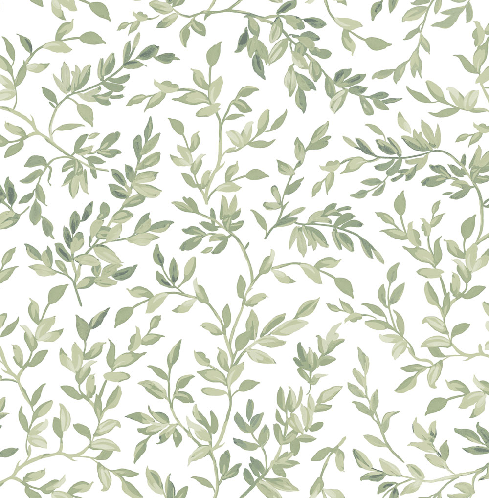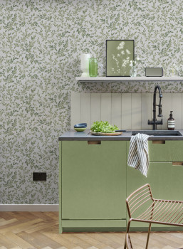 Vliestapete, weißer Hintergrund, Motiv aus Zweigen mit Blättern in verschiedenen Grüntönen.