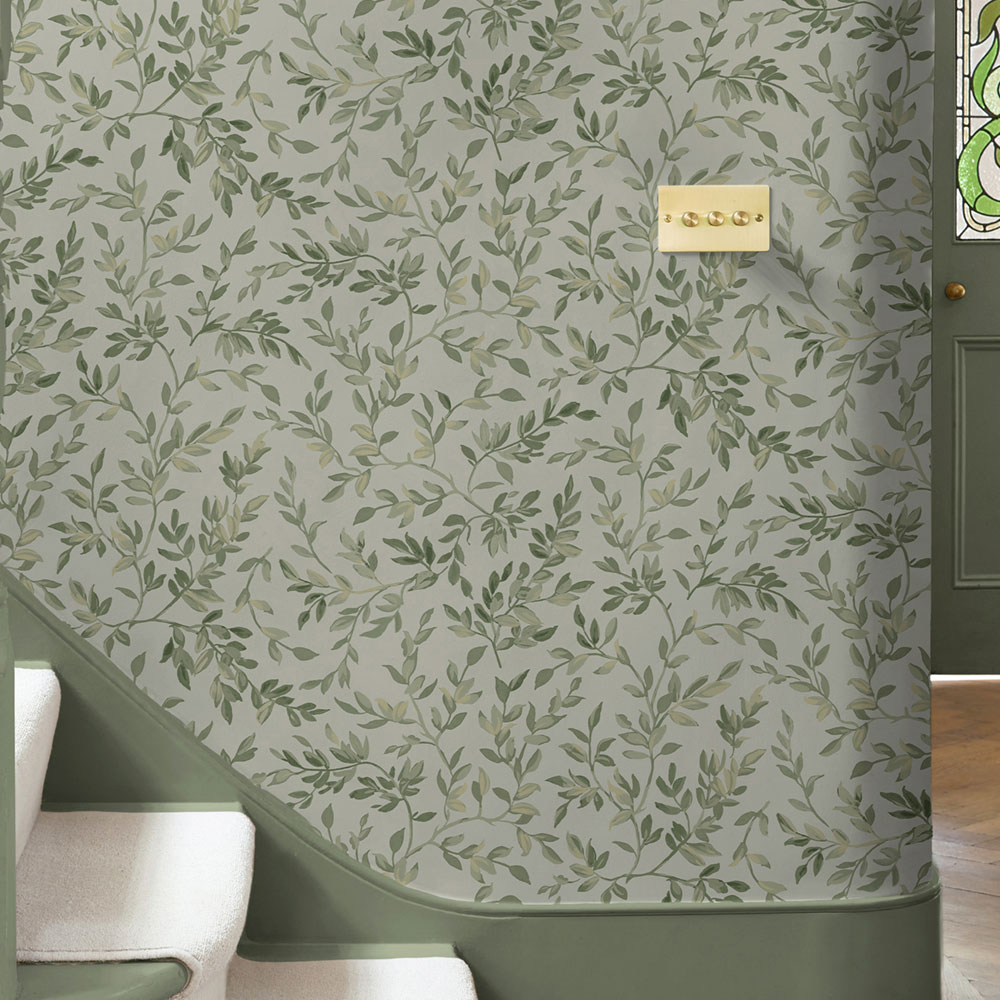 Vliestapete, Motiv aus Zweigen mit Blättern, in verschiedenen Grüntönen.