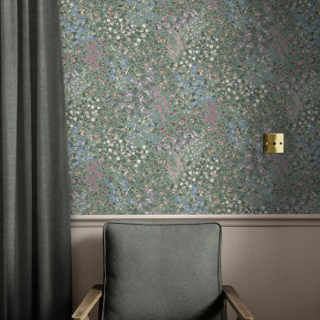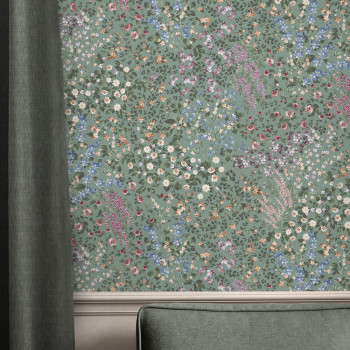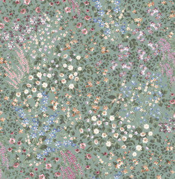 Vliestapete, grüner Hintergrund, Blumenmuster in den Farbtönen Grün, Rosa, Blau, Orange und Violett.