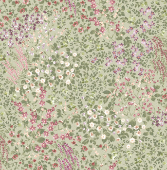 Vliestapete, grüner Hintergrund, Blumenmuster in Grün-, Rosa- und Violetttönen.