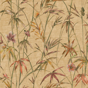 Luxuriöse Vliestapete mit Vinyloberfläche, Stoffstruktur, beigem Hintergrund, Pflanzen in Grün- und Brauntönen, Blüten in Rot-, Rosa- und Brauntönen.