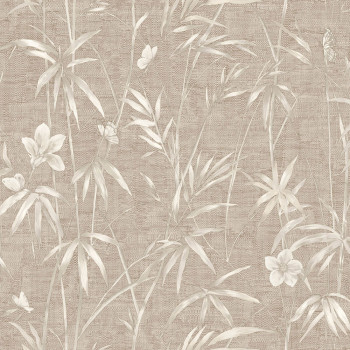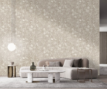 Luxuriöse Vliestapete mit Vinyloberfläche, Stoffstruktur, beigem Hintergrund, Pflanzen und Blüten in Grau-Weiß.
