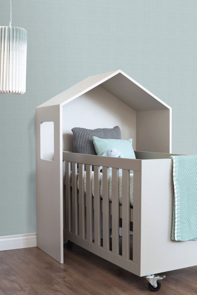 Hellgrüne Vliestapete mit kleinem Würfelmuster.