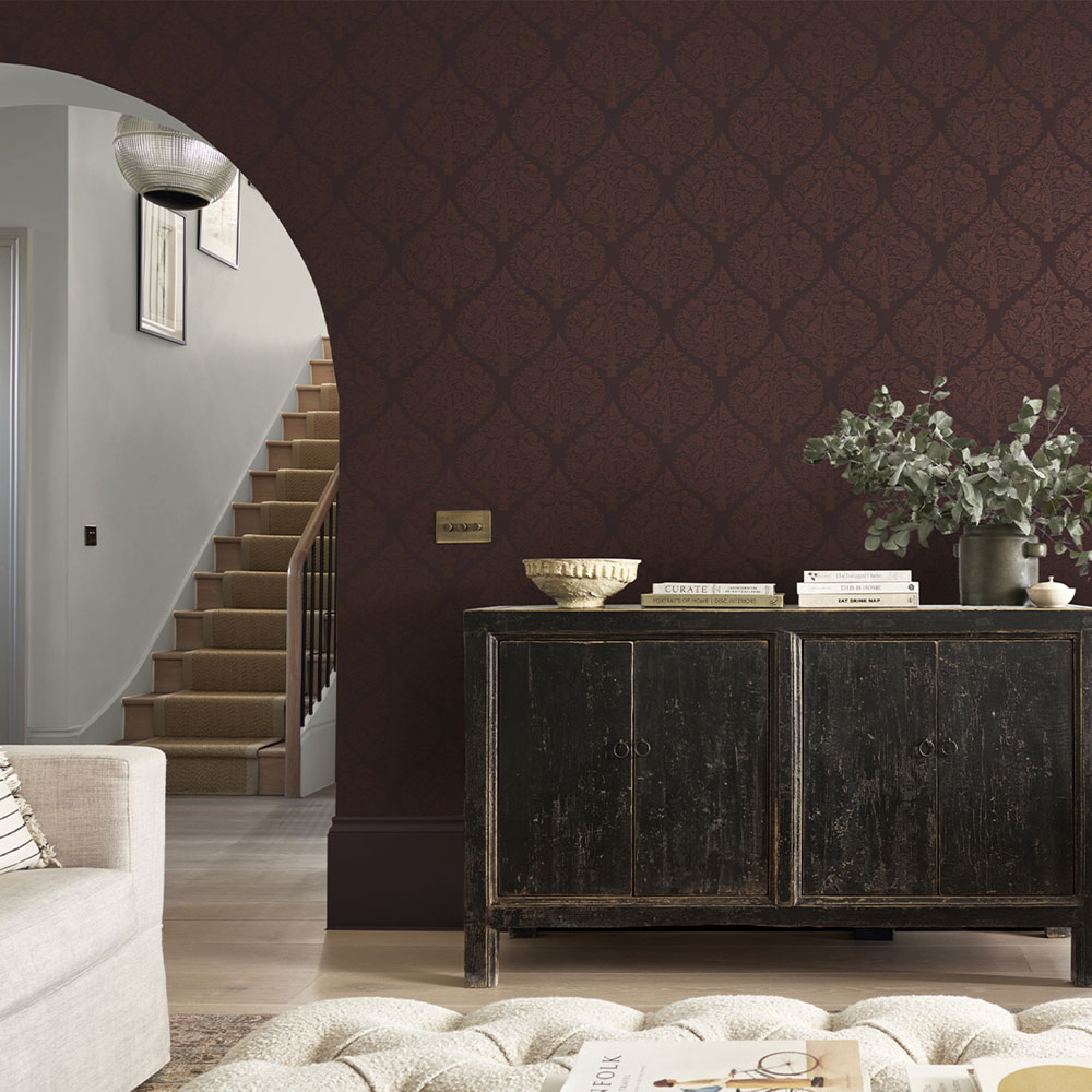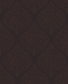 Vliestapete, mattes, dunkelweinrotes Grundmuster, seidenmattes Ornamentmuster mit Pflanzen und Vögel.