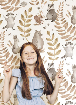 Verspielte Vliestapete für Kinderzimmer, mit Tiermotiven und Blättern, weißer Hintergrund, Tiere in Braun- und Grautönen, Blätter in Rosa und Gold.