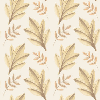 Glatte Vliestapete, weißer Hintergrund, größere braun-beige Blätter mit einer Länge von 20 cm, kleinere orange-braun-graue Blätter mit einer Länge von 15 cm.