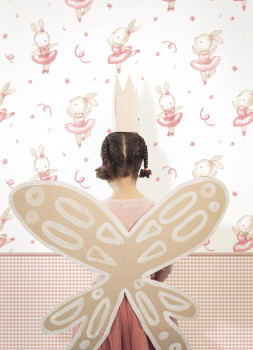 Zarte Vliestapete für Kinderzimmer, tanzende Häschen, weißer Hintergrund, Häschen in einer Kombination aus Rosa, Beige und Braun.