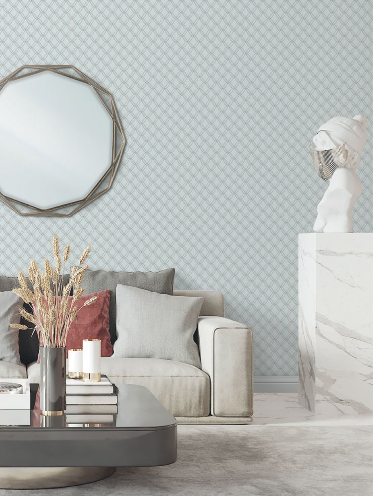 Luxus-Vliestapete. Die Tapete ist grau-blau mit einem grau-silbernen Muster.