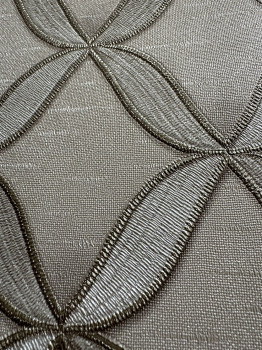 Luxuriöse Vliestapete in Beige mit silbernem Muster, goldenen Konturen und Stoffstruktur.