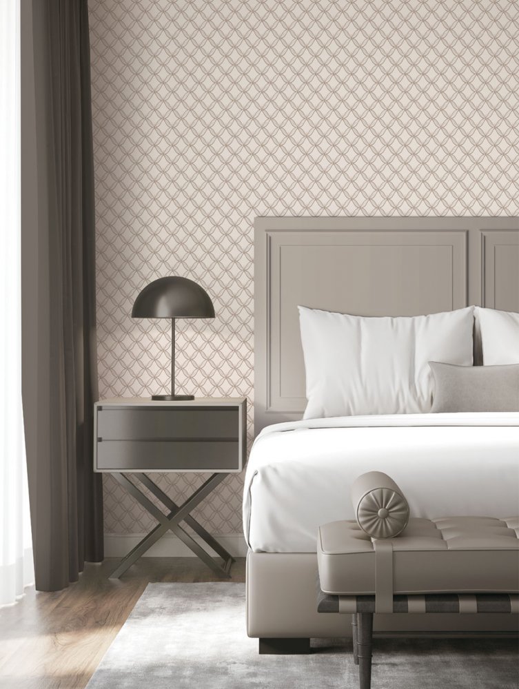 Luxuriöse Vliestapete in Beige mit silbernem Muster, goldenen Konturen und Stoffstruktur.