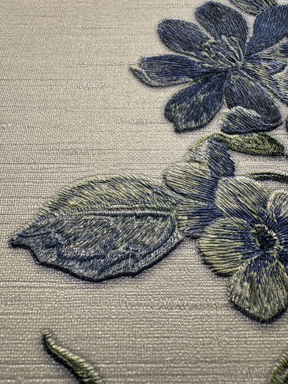 Luxuriöse Vliestapete mit hellgrauem Hintergrund und metallisch blauen Blumen.