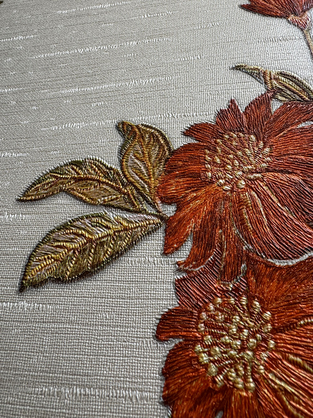 Luxuriöse Vliestapete mit hellbeigem Hintergrund und metallisch-orangen Blumen, Stoffstruktur.